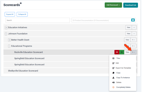 To copy a scorecard, start in the Scorecards list. Click the drop-down arrow to the right of the scorecard you want to copy, and choose Copy.