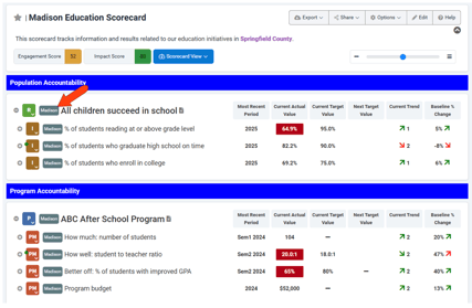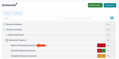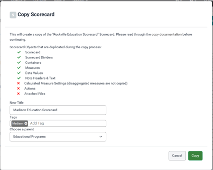 If tags were assigned to the copied scorecard, those tags will be assigned to all objects within that scorecard, replacing any tags from source objects. All measure data and notes are copied from the source scorecard. Because each copied object is unique, editing a program or result, or editing a measure, will affect only the copy, and not the source.