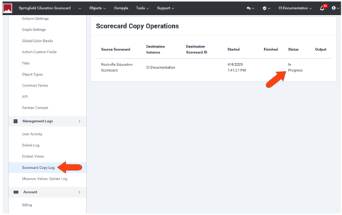 After creating the copy, admin users will see the Scorecard Copy Log, with the copy listed as In Progress or Successful.