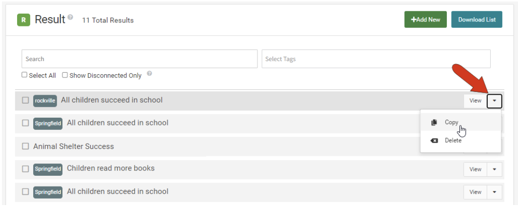 To copy a container, start in the Results or Programs list. Click the drop-down arrow to the right of the object to copy, and choose Copy.