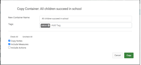 Assign a new container name or keep the original, assign a tag if you want to differentiate between the copy and original, and decide whether to copy the source object’s notes, measures, and actions.
