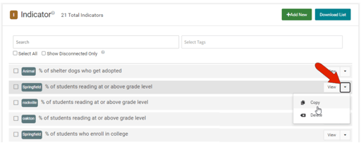 To copy a container, start in the Indicators or Performance Measures list. Click the drop-down arrow to the right of the object to copy, and choose Copy.