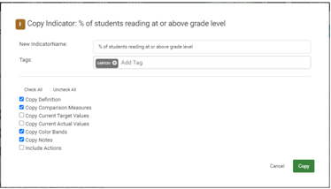 Assign a new measure name or keep the original, assign a tag if you want to differentiate between the copy and original. Decide whether to copy the source measure’s definition, comparison measures, target and actual values, color bands, notes, and actions.
