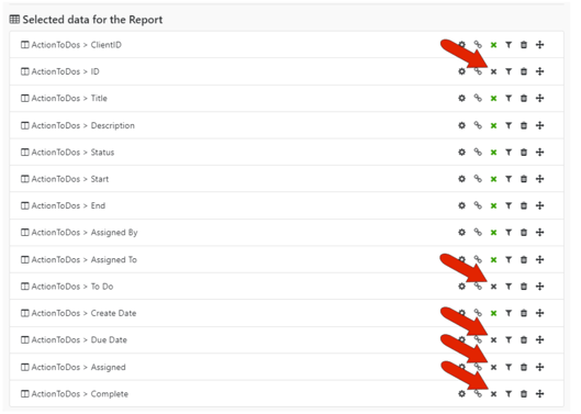 The Selected Data for the Report section lists all fields included in the default report. The x icon for each field is used to control which fields will be included in your custom report. Green icons indicate a field that will not be included. So in this example, the report will include five fields: action ID, action name, due date, assignee, and whether or not the action is complete.