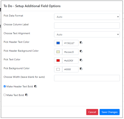 In the formatting window you can set the column label (if other than the default field name), alignment, text and background color, bold, etc.