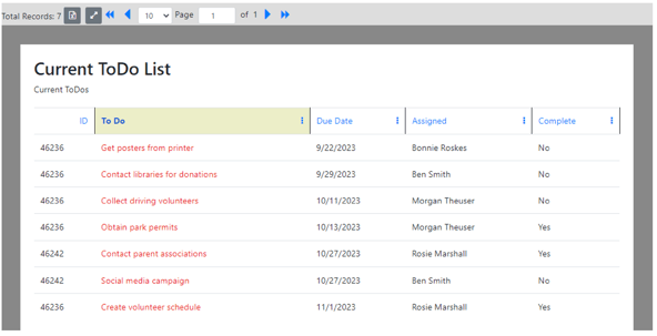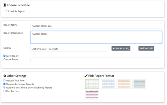The report also now has an edited name and description, to indicate that only incomplete ToDos are included. If you want totals displayed, which in this example will be to-do count totals, be sure to check Include Total Row.