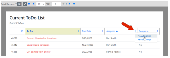 Each column header has a three-dot icon. Choosing Outer Group from the three-dot menu will regenerate the report based on that field - assignees in this example.