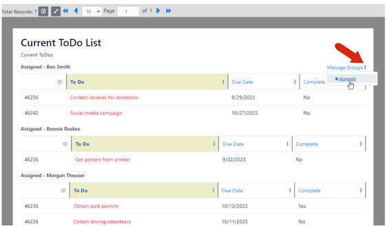 Now the report lists each assignee with their to-dos. To remove the group sorting, click Manage Groups at the top right and remove the field name.