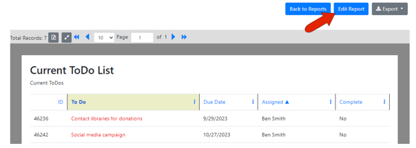 If the report looks good, you can click Export at the top right and choose a format. Or you can click Back to Reports if finished. If you want to make changes to the report, as will be shown in this example, click Edit Report.
