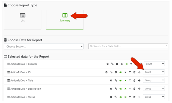 This time the report will be a Summary, so that calculations can be included. The summary report will total the number of actions, so the ID field is changed from the default Group (original field data) to Count.
