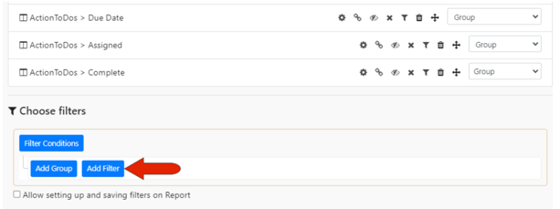 This report will be filtered to show only incomplete ToDos. This is done by clicking Add Filter.