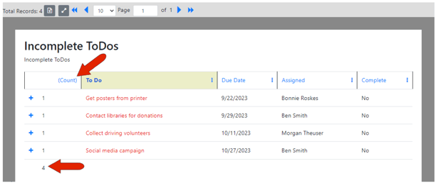 After generating the new report, the ToDo IDs are replaced with count values (1 for each item), with a count total at the bottom.
