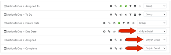 Returning to report editing, another way to generate a report is to create nested objects in which additional details are displayed when expanding a row. In this example, the details of due date, assignee, and completion are displayed Only in Detail.