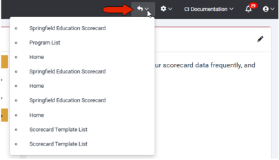- Click the Back arrow for a list of recently-visited Scorecard pages.