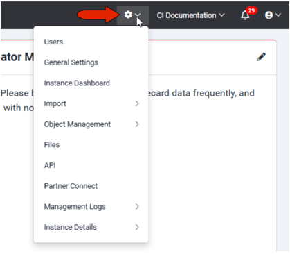 - Click the Gear icon for access to site-level settings including Users, General Settings, Files, etc. (Access depends on your admin permissions.)
