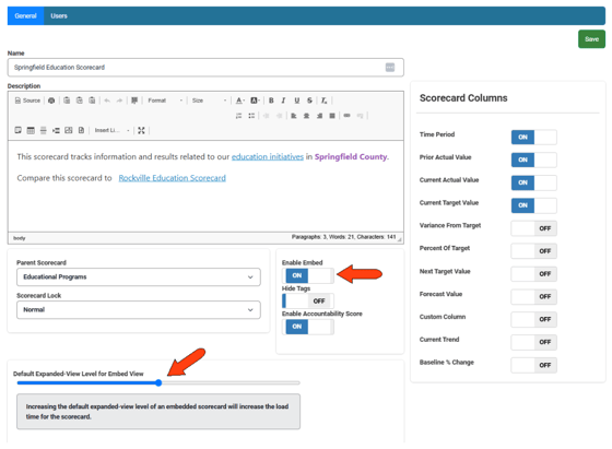 To enable embedding for a scorecard and its objects, you’ll need to edit the scorecard, and edit its General settings. Toggle on the Enable Embed slider, and set the default expanded-level view. Be sure to save any changes.