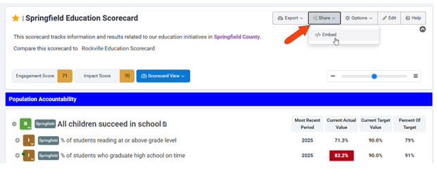 To get embed codes for a scorecard, start by viewing the scorecard. At the top, choose Share / Embed. (You can also hide tags by choosing that option from the Options menu.)