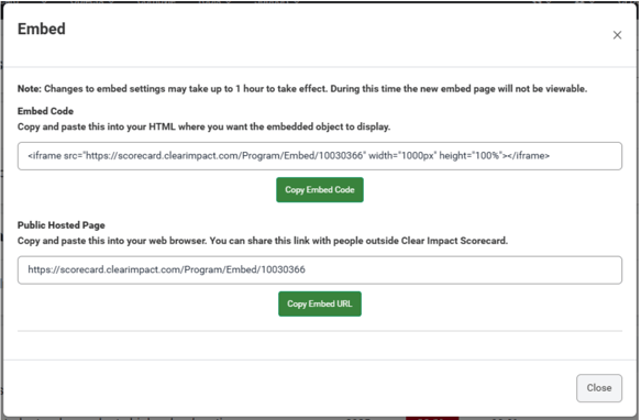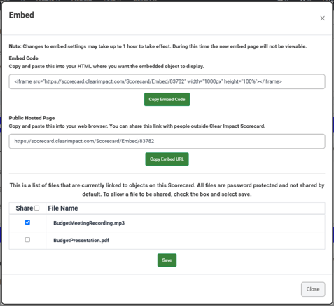 The Embed window lists two embed codes, each with a Copy button. Embed Code is the HTML code you can insert into your own web page. Public Hosted Page is a dedicated URL, hosted by Clear Impact, which will display the scorecard. If the scorecard has file attachments, you can choose whether to share those files on the web page.