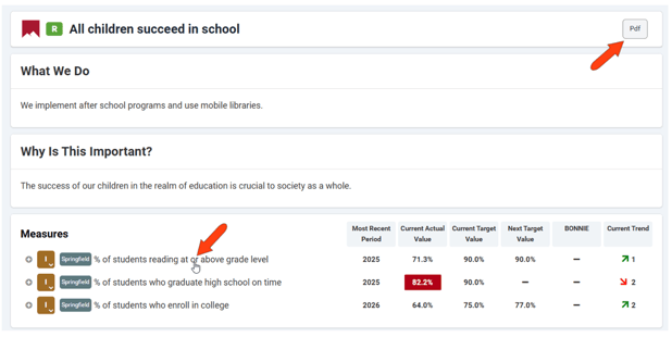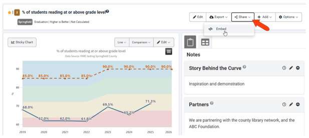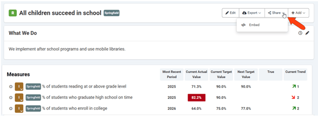 To embed an indicator or performance measure, view the measure and choose Share / Embed.