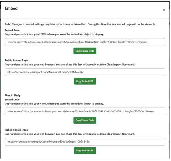 As for a scorecard, the Embed window for a container also provides an Embed Code and Public Hosted Page URL.