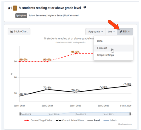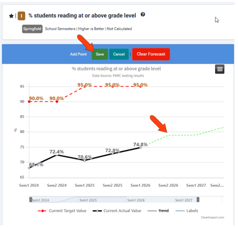 When entering data values into a measure, you can also project forecasted values to display in your data graphss. Adding forecast values is one way to help boost your scorecard’s engagement score.