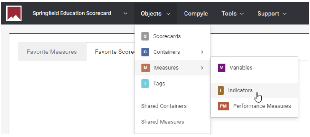To view the measures in your instance, choose Objects / Measures / Indicators or Performance Measures or Variables. (If an admin user has created other measure types, those will also appear on this menu.)