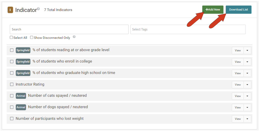 Note: This article covers the features and options for the Indicators list. Options and features for the Performance Measures and Variables list are identical.