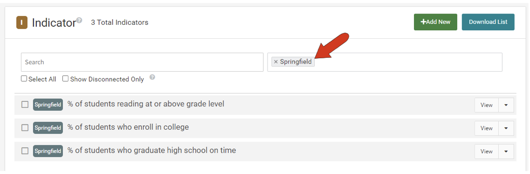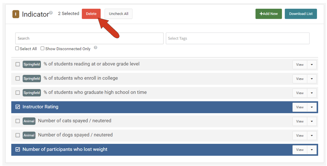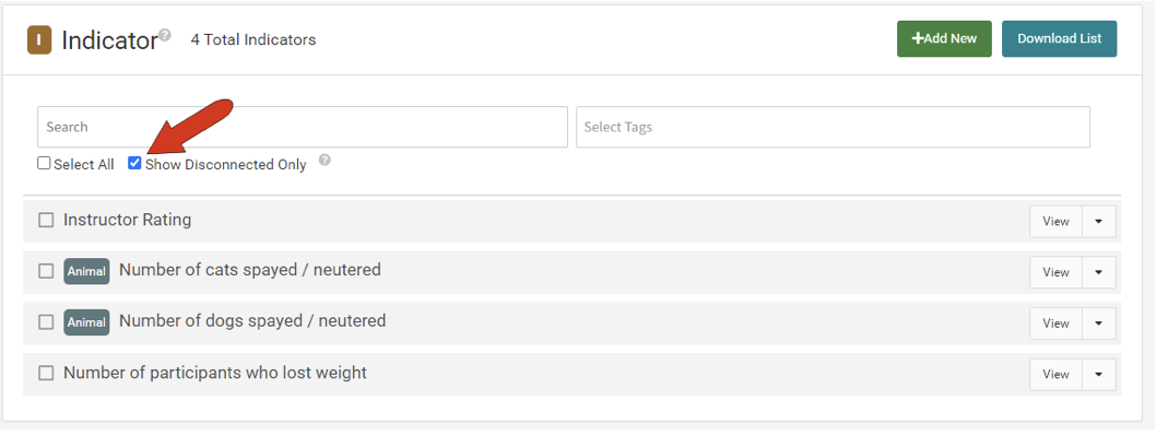 Note: To clear out all disconnected indicators at once, you can apply the filter, click the Select All button, then delete all at once.
