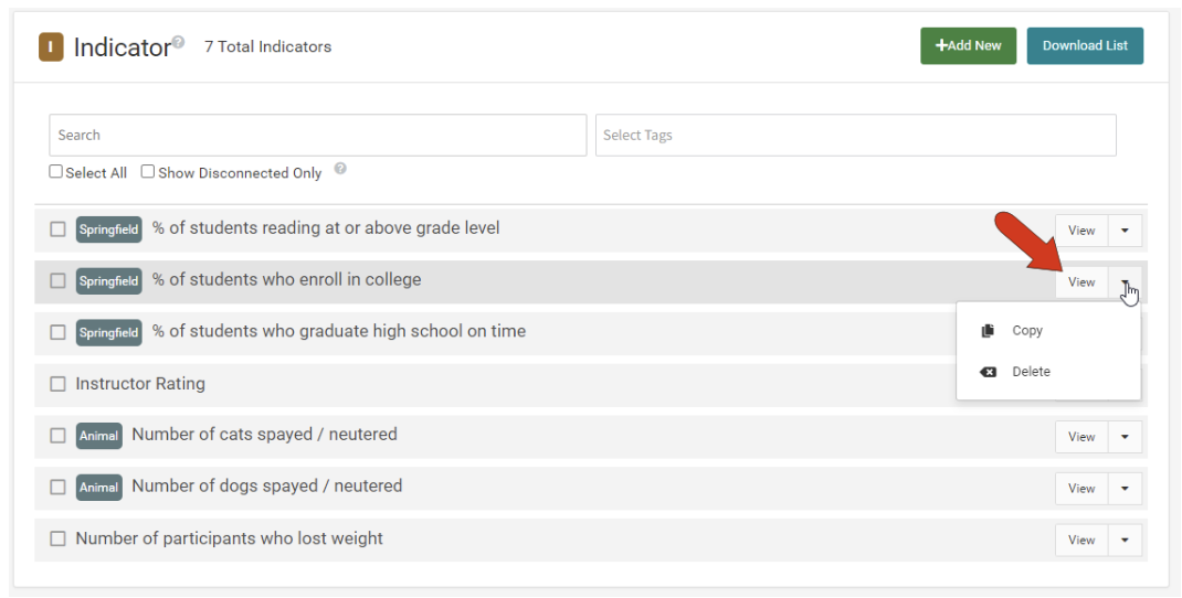 Each indicator has a View button, which can be clicked to display the indicator and its data. The drop-down arrow next to this button displays options to Copy or Delete the indicator. Use caution when deleting an indicator! A deleted indicator will be removed from all scorecards that contain that indicator.