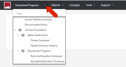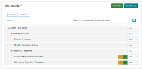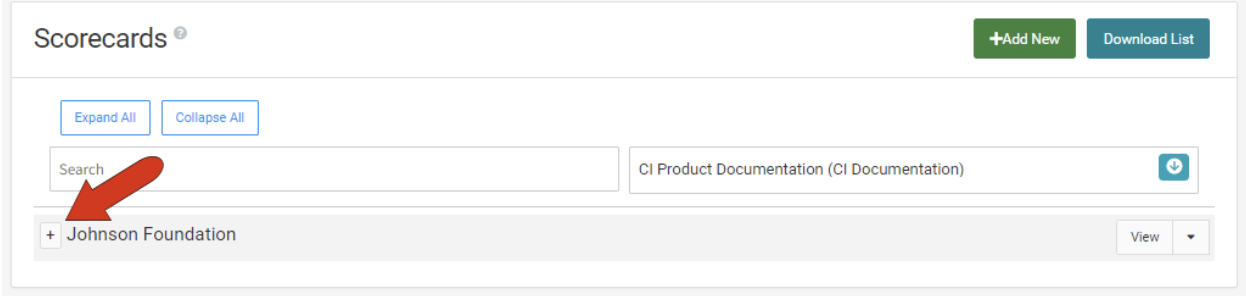 In the example below, the Scorecards list contains an empty scorecard set up for the umbrella “Johnson Foundation.” The + icon indicates that the scorecard is a parent, and can be expanded.