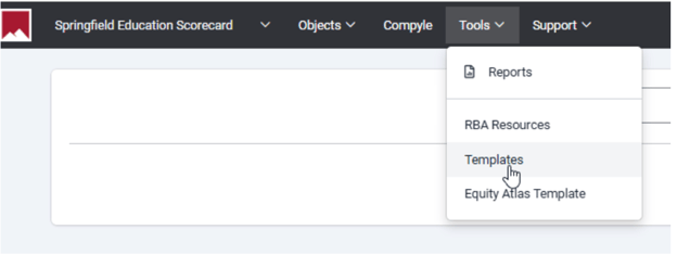 The Tools menu has two options for scorecard templates: Templates and Equity Atlas Template. These enable you to see how successful scorecards are set up, and you also may find templates here you can use for your own organization.