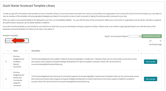 Choose Tools / Templates to see a list of scorecards that have been created by other organizations, who helpfully sent their scorecards to Clear Impact for use by others. You can use a search term to narrow the list.