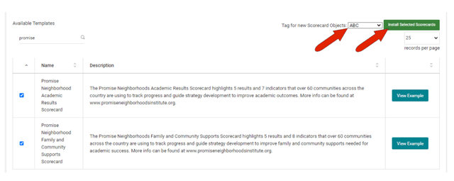 To add a template to your instance, check its selection box, then click Installed Selected Scorecards. You can also add tags to the scorecards. Once installed, you can edit a scorecard as needed to customize it for your needs.