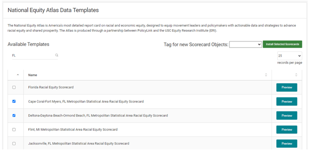 Choose Tools / Equity Atlas Template to see data sets from the National Equity Atlas. This is America’s most detailed report card on racial and economic equity, including scorecards and their program data from over 300 geographical areas.
