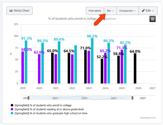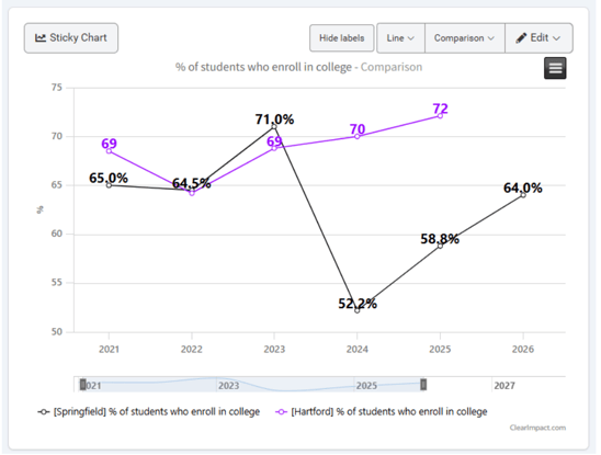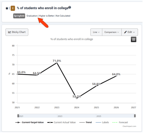 This example focuses on the measure “% of students who enroll in college.” This measure uses a custom frequency of Graduation years. Only current actual values are displayed.