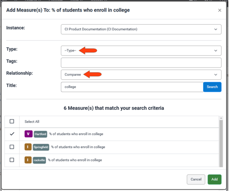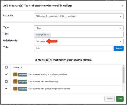 In the Add Measure(s) To window, set the relationship to Comparee. To find the measures, you can filter by type, tags, or title, then click Search to see the results. Only measures that have the same frequency as the target measure will be available for selection. Select the measure(s) to compare and click Add.