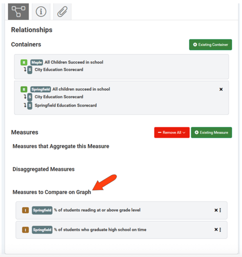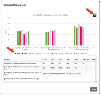 When viewing an indicator or performance measure, you can compare its data to data from one or more other measures.