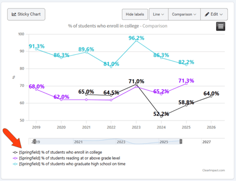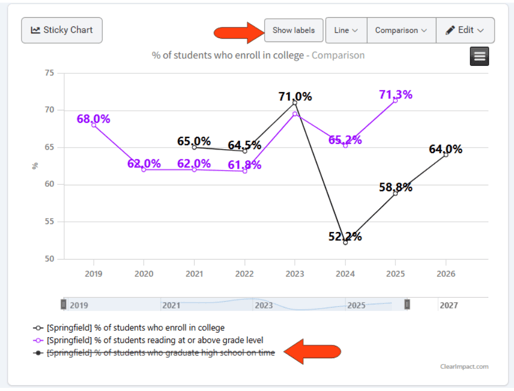 You can Hide Labels or Show Labels, and turn off one or more data sets by toggling the visibility icons in the graph key.