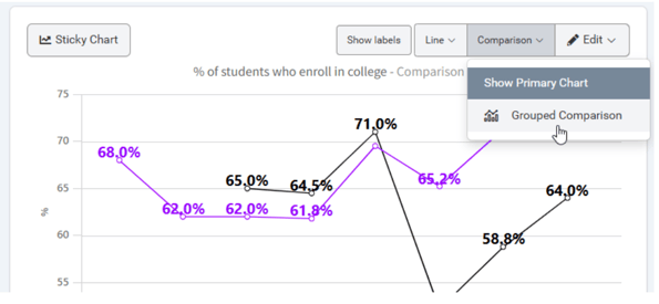 Starting over with the same college enrollment measure example, this time we’ll be comparing data to similar college data from another region.This data is contained in a variable.