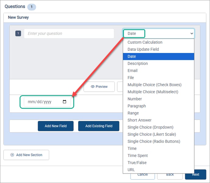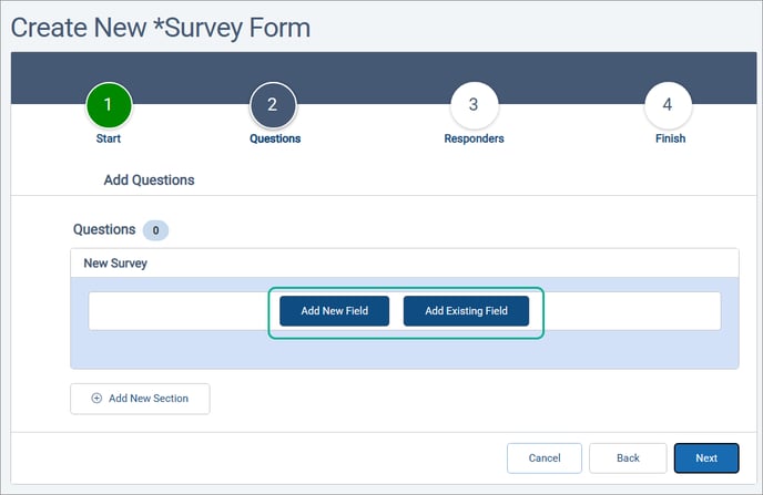 If you already have questions set up for previous surveys, you can reuse them. To search for an existing question, click Add Existing Field