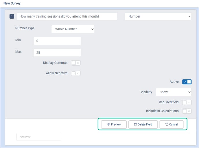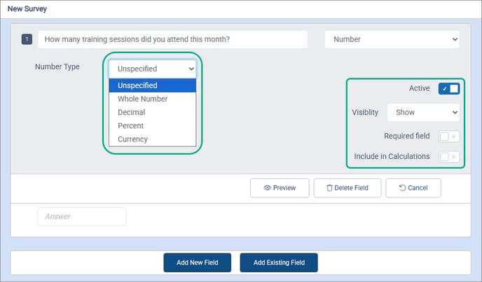 As an example, the question “How many training sessions did you attend this month?” should have a Number answer. You can also choose whether the question is active, whether it is displayed or hidden, whether an answer is required, how the number is formatted, and if number values can be included in calculations.