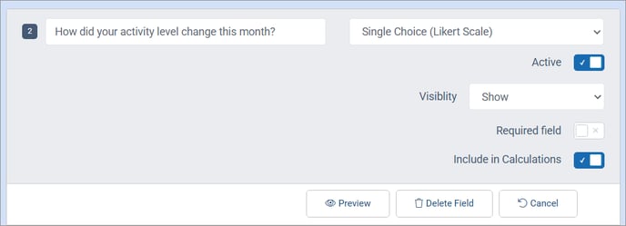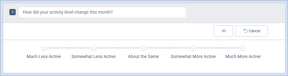 The next question in this example is “How much did your activity level change this month?” This question will require a single answer from a list of answers, so the format can either be Single Choice (Radio Buttons), Single Choice (Dropdown), or Single Choice (Likert Scale).