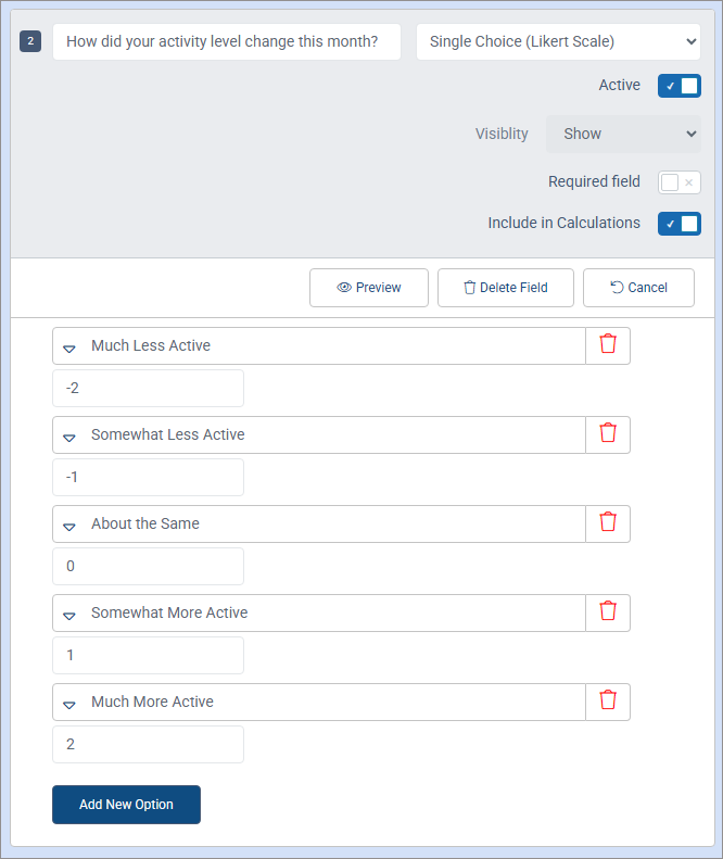 The list of answers is entered just below the question, in the Answer Choice fields. Start with the first answer, click Add New Option, and continue with the rest of the choices. In this example, a Likert Scale field is used, which automatically includes numeric values for each field option. For radio button and dropdown fields, there will be an option to "Enable numerical values for options" in the field properties. For numeric fields and option fields with numeric values, you can choose "Include in Calculations" if these fields will be part of a formula.