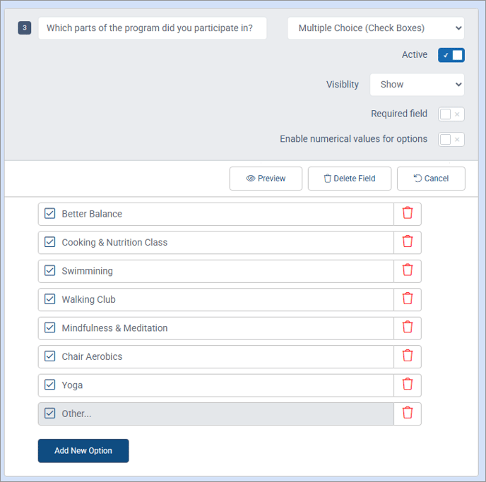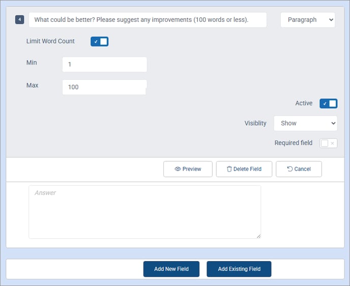 Each question has buttons at the lower right which can be used to preview, delete, or cancel editing the question. More questions can be added via the Add New Field button.