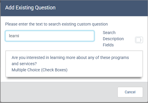 Enter a search term, and if any questions that you’d like to add are found, just click the name of the existing field to add that question to the form. You can edit the question wording and answer options.