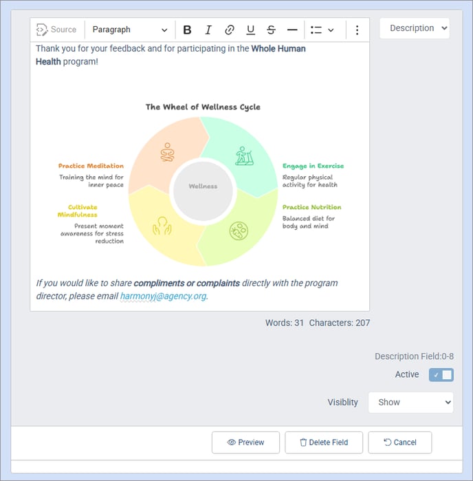 When you have instructions or other information to share with the person completing the form, you can add a Description field. You can communicate with a combination of rich text, images, and links.