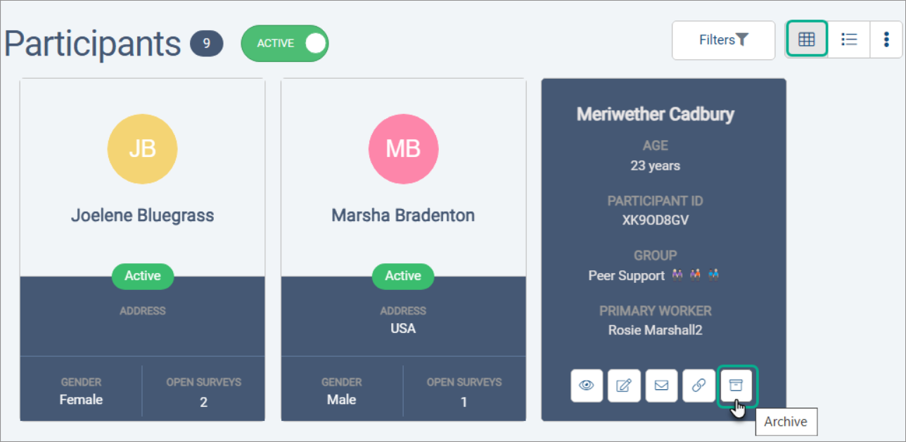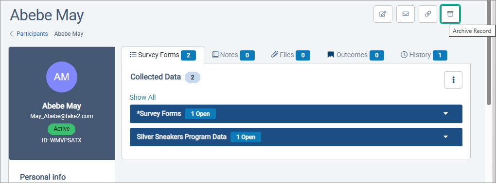 Participants and Organizations may be archived but not deleted if they have any additional records. This is a precaution to prevent accidental removal of information that is needed later. These additional records for Participants/Organizations could be completed survey form responses, note form entries, or uploaded documents. Archived records can be restored later if needed from the inactive records search.