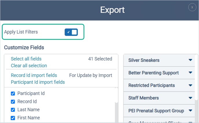 Similar list filter choices can be found in the All Organizations search list and the Group member list for both participant groups and organization groups. In all four places, you now have the option to apply those same list filters to your export.