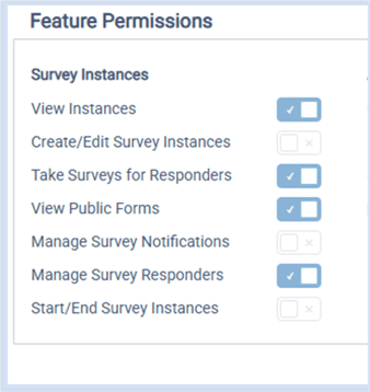 • Start/End Survey Instances: Start a pending instance. Close an In Progress instance. Reopen a Closed instance. Start All Pending and Close All In Progress Instances buttons