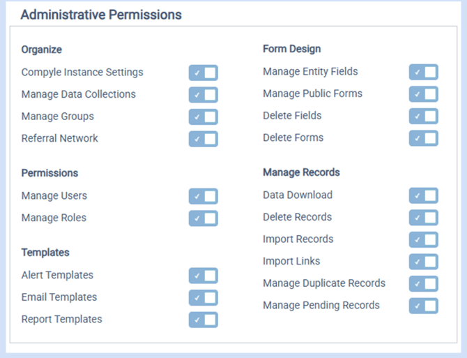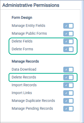 Delete: Access to delete records, delete fields, and delete forms is only assigned to Administrators. Custom roles may be granted delete permissions, but archive rights are strongly recommended.